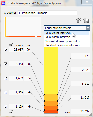 When you select a grouping variable, Strata Manager starts. It fills in the value for the distribution of this variable, Hispanic population, over the current source layer, ZIP codes: