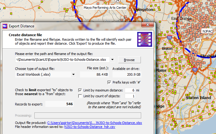 To illustrate the Scan/US distance report, we will produce a table showing the distance from a set of seven source objects to a group of over 500 destination objects. The source objects are the seven performance venues of the New Jersey Symphony Orchestra (NJSO), and the destination objects are all public schools within a ten-minute drive of the seven symphony concert locations.