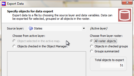 When you choose "All roster objects" from the "layer roster" side of the dialog, you get all the objects. It's worth reflecting a moment on what this means. Notice that under "Total objects to export," it says 51 objects. This is the 48 states, plus Alaska, Hawaii, and the District of Columbia, but not including the U.S. territory of Puerto Rico. The "roster" includes objects from more than one study area, and exports data from them whether they are currently in view, or not.