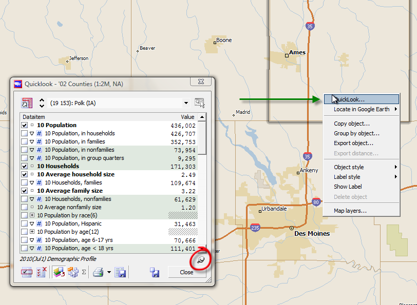Demographic data is shown for Pottawattamie County. Another way to bring up Quicklook is to right-click on the map, and choose Quicklook from the context menu: