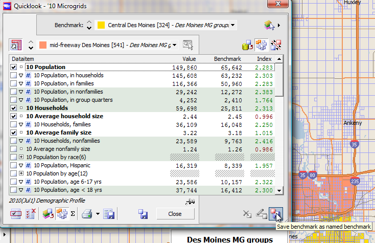 The Index column represents the Value divided by the Benchmark. Thus, the 2010 population in "mid-Freeway Des Moines" is 1.655 times greater than the population in Pottawattamie county. Since Pottawattamie County is way over on the other side of Iowa, this comparison is not too relevant. We can get different numbers by changing to the named benchmark we saved earlier, which we called "Polk County, Iowa, Des Moines."